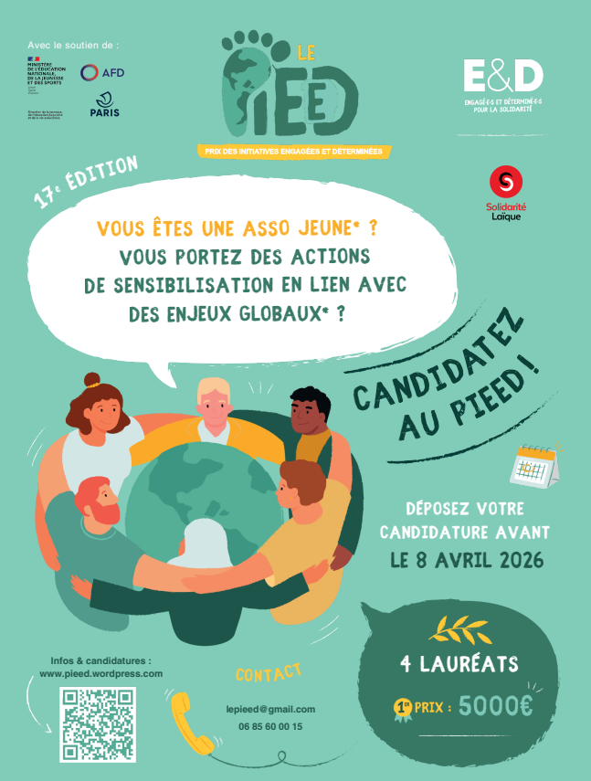Le PIEED (prix des initiatives engagées et déterminées, anciennement prix des initiatives étudiantes d’éducation à la citoyenneté et à la solidarité internationale) récompense chaque année des initiatives originales et innovantes portées par des associations de jeunes, qui visent à informer, sensibiliser et mobiliser les publics en France autour des enjeux de solidarité internationale et de citoyenneté mondiale.