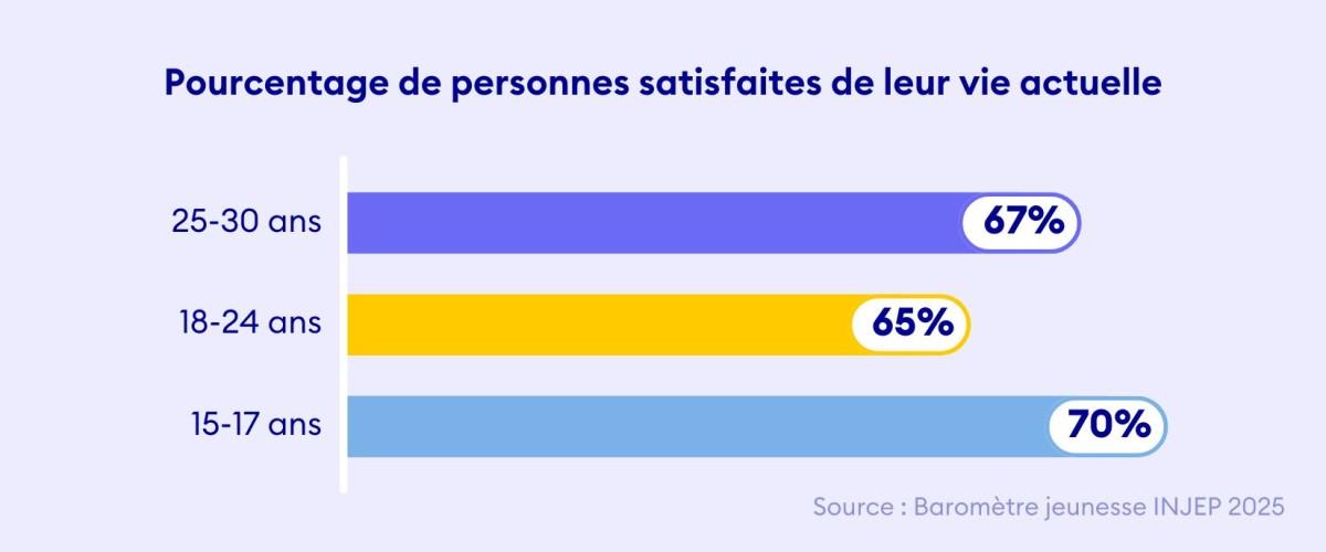Début 2025, 67 % des jeunes âgés de 15 à 30 ans déclarent que leur vie actuelle correspond à leurs attentes, soit une baisse de 4 points par rapport à 2024. Cette diminution est d’autant plus notable que, pour la première fois depuis trois ans, le taux de satisfaction des personnes âgées de plus de 31 ans dépasse celui de leurs cadets.