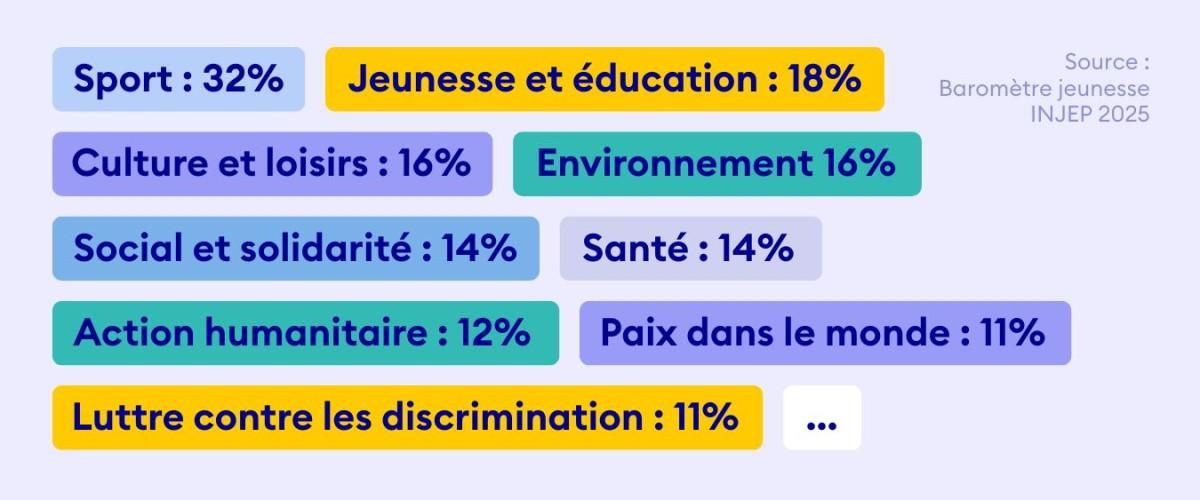 Comme en 2024, le sport s’avère être le premier domaine d’engagement des jeunes bénévoles. Il est suivi par la jeunesse et l’éducation (18 %), puis par la culture, les loisirs et l’environnement, qui rassemblent chacun 16 % des répondants. L’action humanitaire et l’aide au développement mobilisent également une part significative des jeunes, avec 12 % des bénévoles entre 15 et 30 ans œuvrant dans ce domaine.