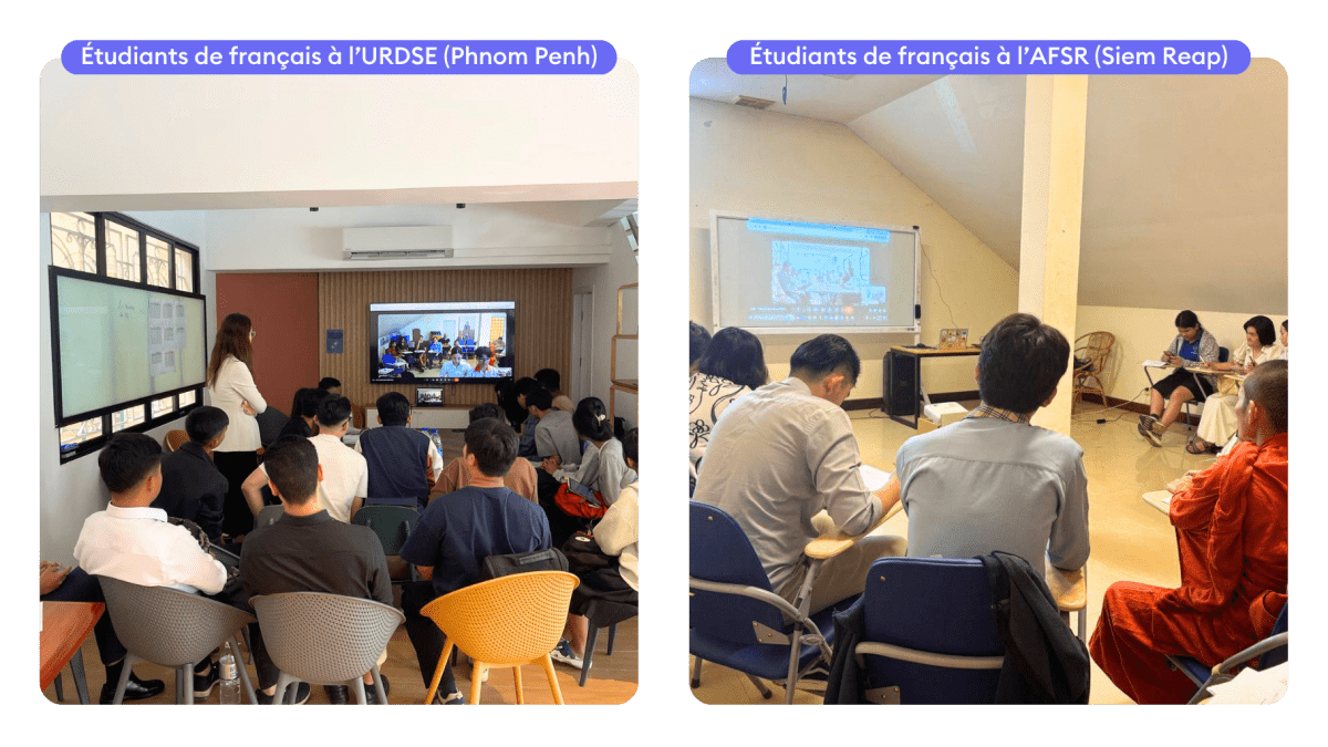 Les dynamiques de mise en relation encouragées par le programme ont permis à deux volontaires d’initier une rencontre virtuelle entre des étudiants apprenant le français au sein de leurs structures respectives. Juliana, coordinatrice pédagogique et institutionnelle à l’Université Royale de Droit et des Sciences Économiques de Phnom Penh, et Laëticia, coordinatrice pédagogique en FLE à l’Alliance Française de Siem Reap, ont ainsi favorisé les échanges entre apprenants.